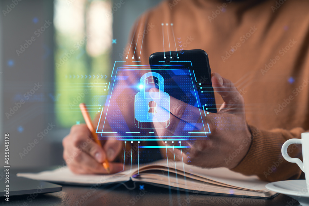 Man read text send holding using smartphone. Typing at office workplace with notebook. Concept of distant work, business education. Security info, datum protection, lock