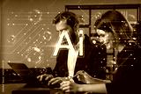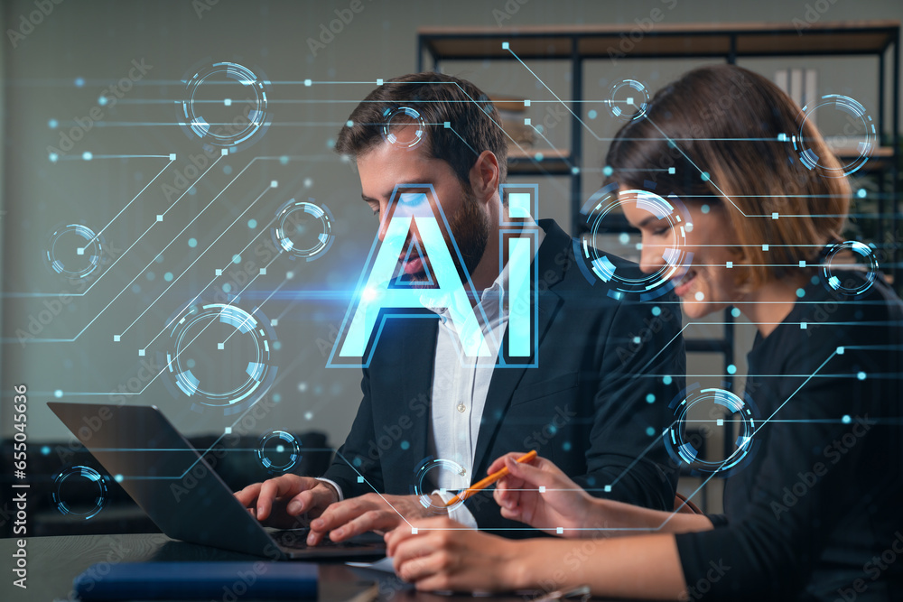 Thoughtful businesspeople working together at office workplace. Concept of team work, business education, internet surfing, brainstorm, project information technology. Ai technology icons