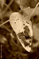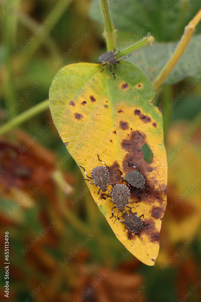 Close-up of many brown marmorated shield bugs on yellow soybean leaf in the field. Halyomorpha halys in Italy