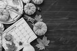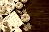 Build a Thanksgiving table that leaves a lasting impression. Top view photo of calendar, plates, cutlery, ripen pumpkins and seasonal attributes on wooden background with ad spot