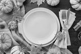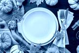 Share the spirit of gratitude through your table arrangement. Top view shot of blank plates, cutlery, pumpkins, warm blanket, cones, napkin, dry fallen leaves on wooden background