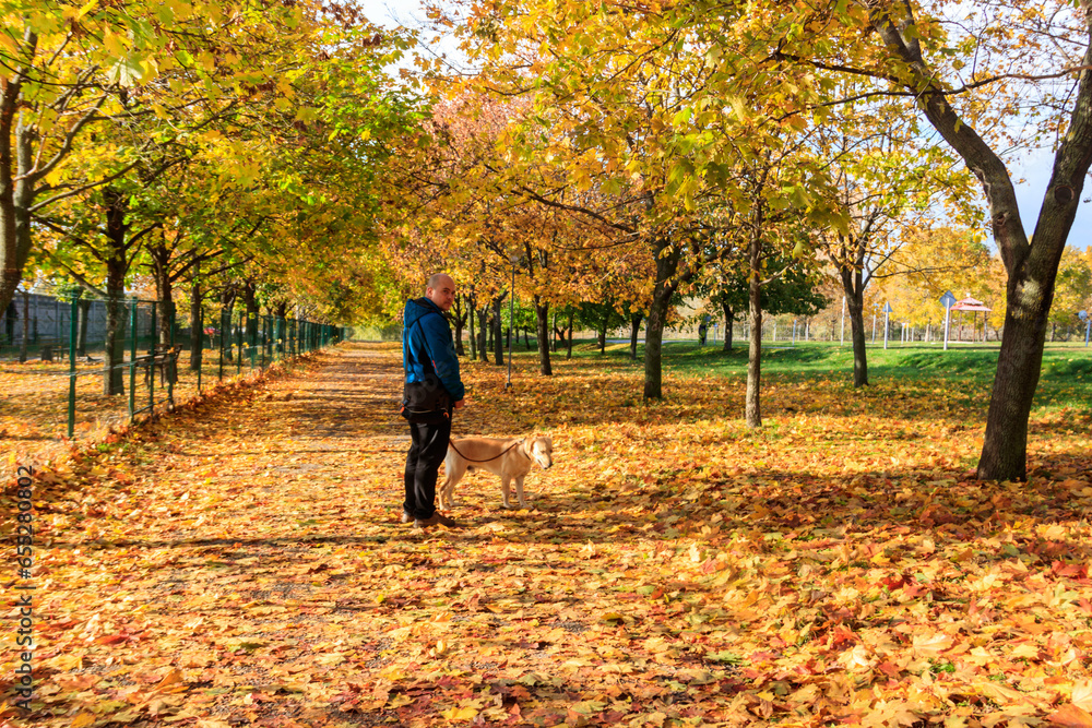 Handsome man walking his labrador retriever dog in autumn park