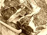 Two fresh steaks lying on a wooden cutting board. View from above, close-up. Delicious and healthy food concept