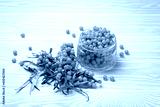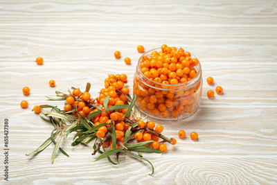 Sea buckthorn ripe berries in glass jar and branches with leaves top view on white wooden rustic background, great for skin, heart, vessels and immune system.