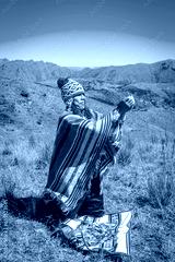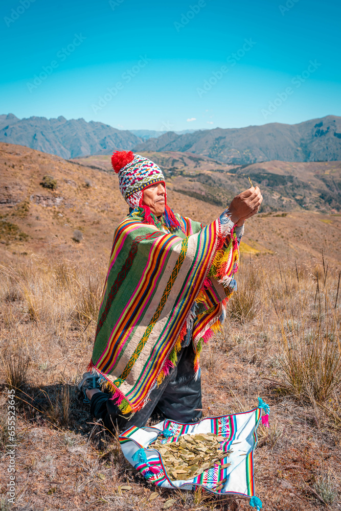Chaman en los andes del Perú con hoja de coca en las manos.
