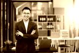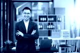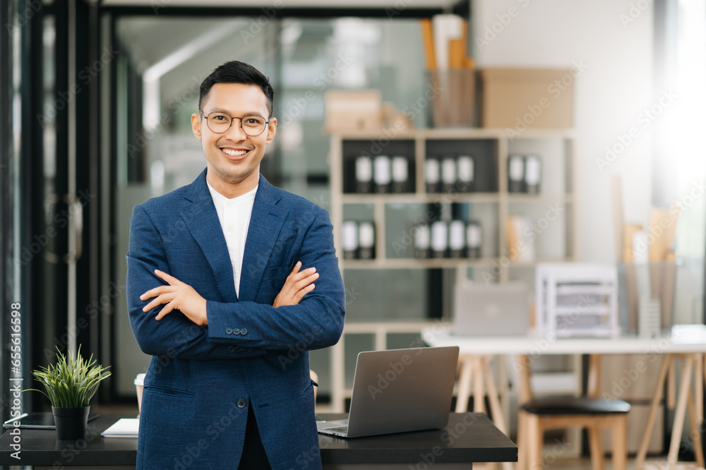 Young attractive Asian man smiling thinking planning writing in notebook, tablet and laptop working from home, looking at camera at office