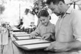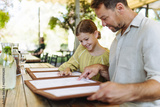 Father and daughter reading menus in a restaurant, choosing food and drinks.