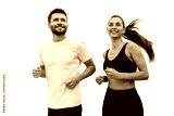 People are friends running together a man and a woman in fitness clothes. Sports couple coach and client doing a workout. Healthy and active lifestyle. Isolated background.