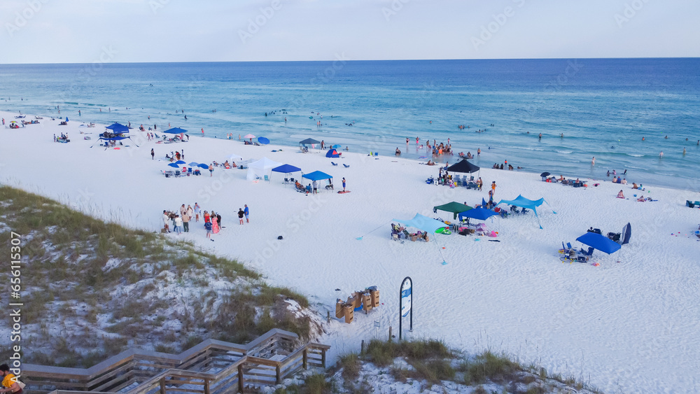 Aerial wooden ram access into Miramar Beach, white sandy shoreline, turquoise water, crowded diverse people swimming, relaxing, colorful tents, canopy, chairs, Destin, Florida