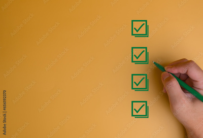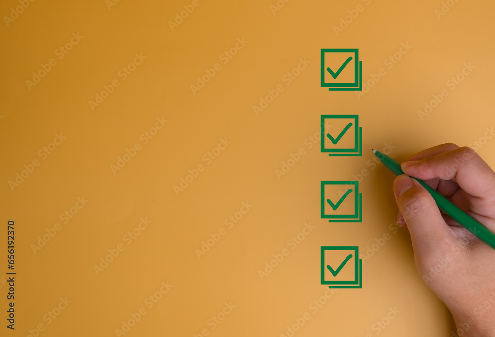 Businessman checking mark on the check boxes with marker green. Tick Checklist form feedback, satisfaction, exam on background concept.