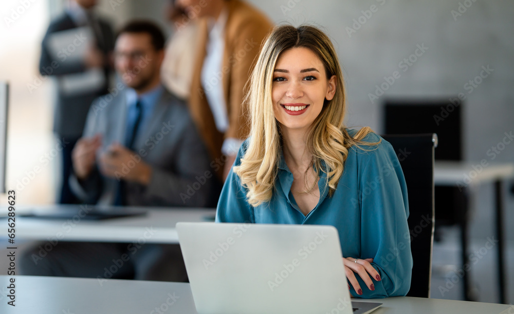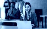 Successful young attractive businesswoman working on laptop in her workstation at office