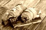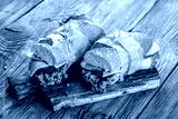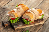 Healthy sandwich salami, tomato, lettuce and cheese on a wooden board. banner, menu, recipe place for text, top view