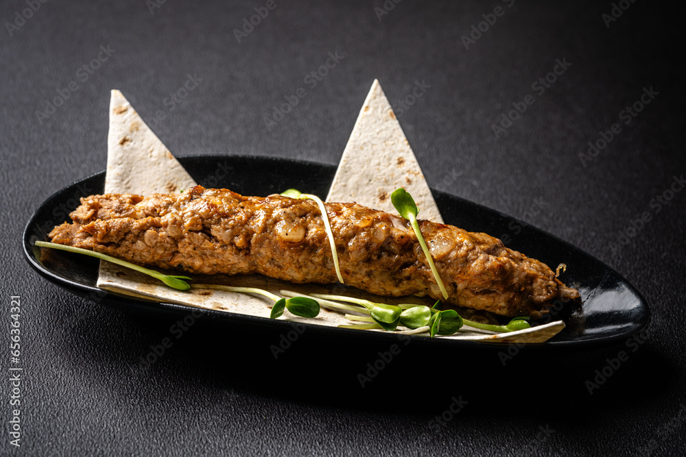 Turkish cuisine. Lula beef kebab lies on a plate with lavash