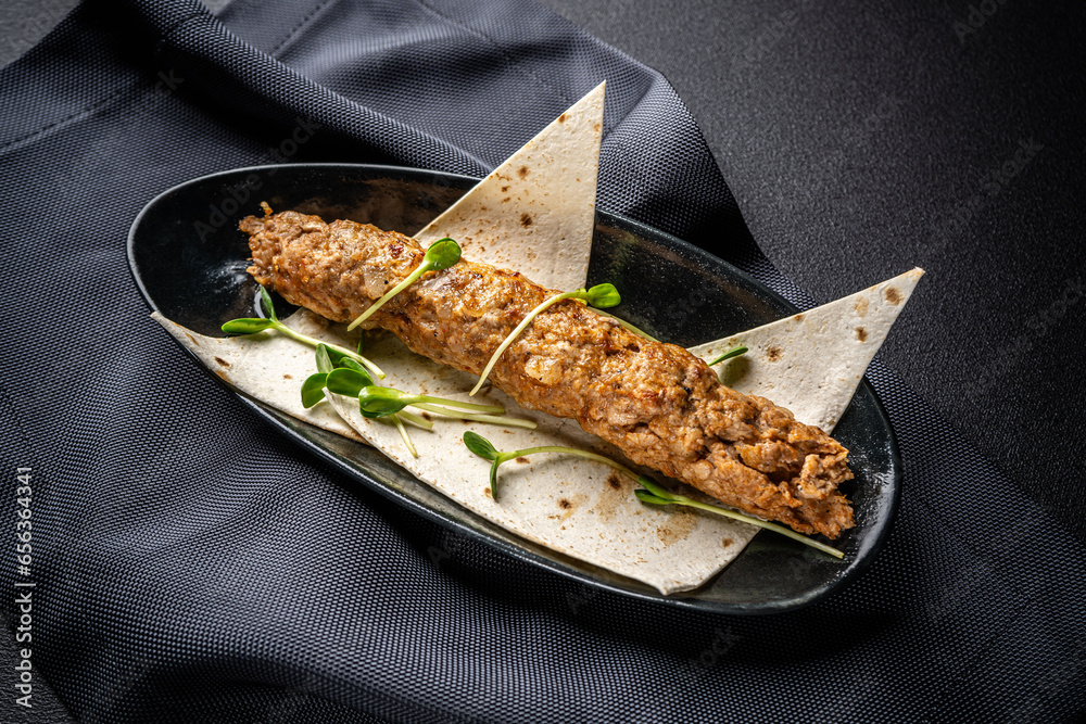 Turkish cuisine. Lula beef kebab lies on a plate with lavash