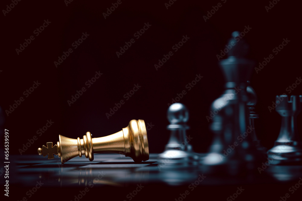 Fallen of golden king chess among silver chess figure. Defeat and loss of business competition and marketing strategy planing concept.