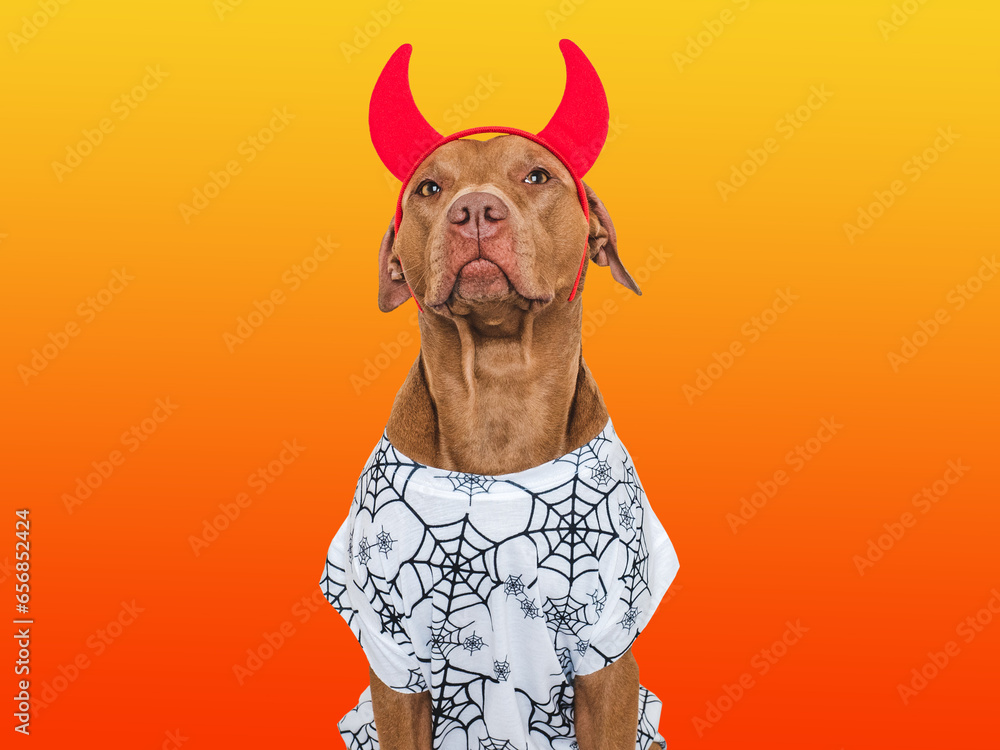 Cute dog and devil's horns. Isolated background. Close-up, indoors. Studio shot. Congratulations for family, relatives, loved ones, friends and colleagues. Pets care concept