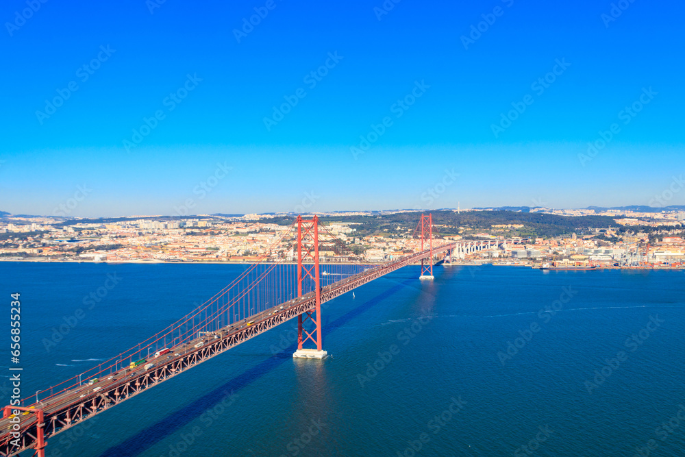 The 25th April Bridge (Ponte 25 de Abril) is a suspension bridge road-rail over the Tagus river that connects the city of Lisbon to the city of Almada. View from Almada.