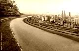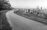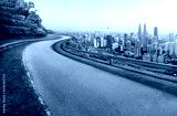 Road with cityscape and skyline in Kuala Lumpur, Malaysia. Sunrise Scene. Logo removed.
