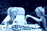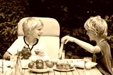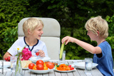 Two brothers having healthy lunch outdoors