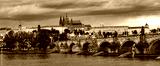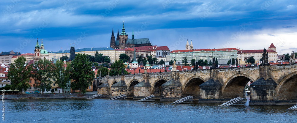 Prague Castle, Charles Bridge and boats on the Vltava river. View of Hradcany Prague Castle, Charles Bridge and a boats on the Vltava river in the capital of the Czechia.