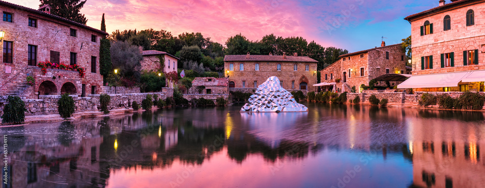 Thermal bath town of Bagno Vignoni, Italy during sunrise. Old thermal baths in the medieval village Bagno Vignoni, Tuscany, Italy. Medieval thermal baths in village Bagno Vignoni, Tuscany, Italy