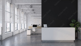 Black brick open space office interior with narrow window and curtain, A white reception. a blank dark wall. Modern office interior with concrete floor. Side view. 3d rendering