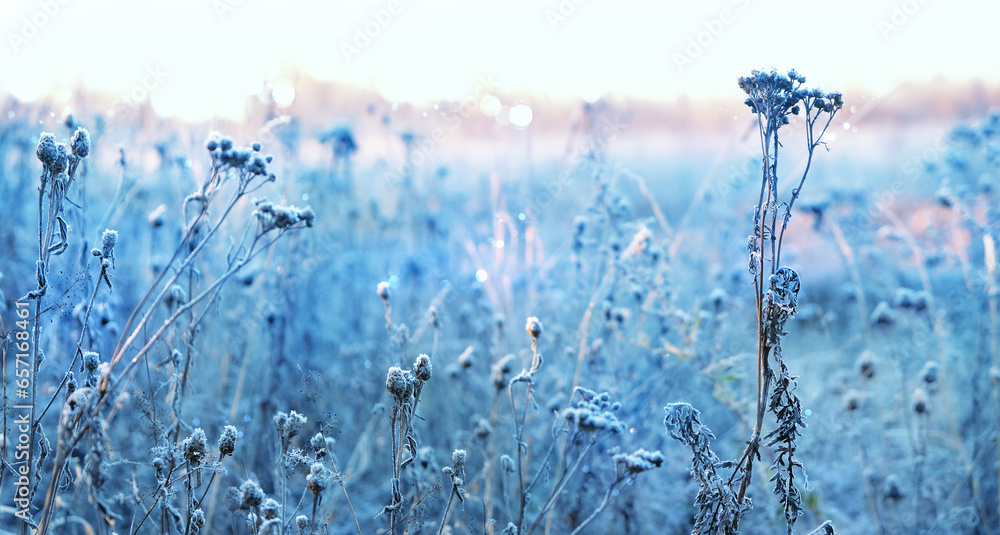 frozen grass field, natural abstract background. beautiful gentle landscape. cold frosty weather. flowers covered snow crystals. Late autumn or early winter season