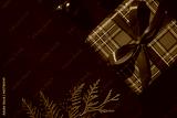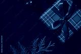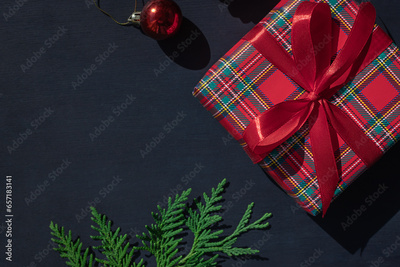 Christmas concept composition with tartan pattern gift box on the dark blue wooden background. Winter holiday greeting card. Copy space