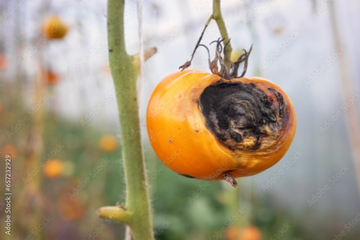 Close up photo of organic tomato infected by Phytophthora infestans, selective focus.