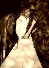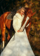 pretty young girl in wedding dress posing with her bright red horse in forest at sunny autumn day.