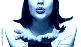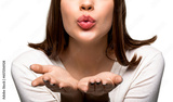 Attractive woman showing air kiss. Pretty attractive lady send air kisses open palm flirting, tempting lips. Sweet girl with air kiss with pout lips two palms. Beautiful woman sending air kiss