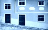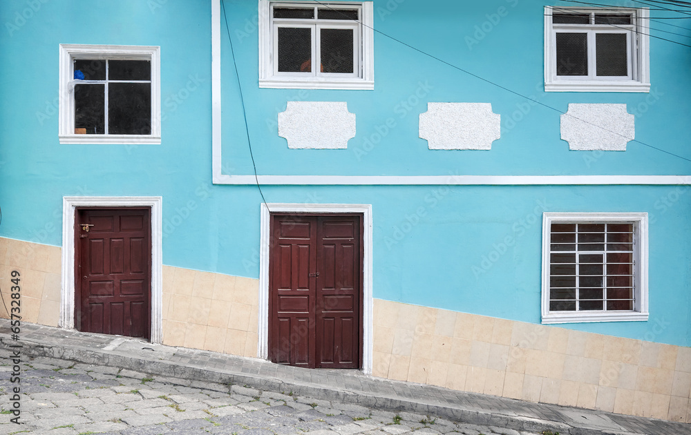 Street view of the facade of an old colonial building, architecture background, Ecuador.