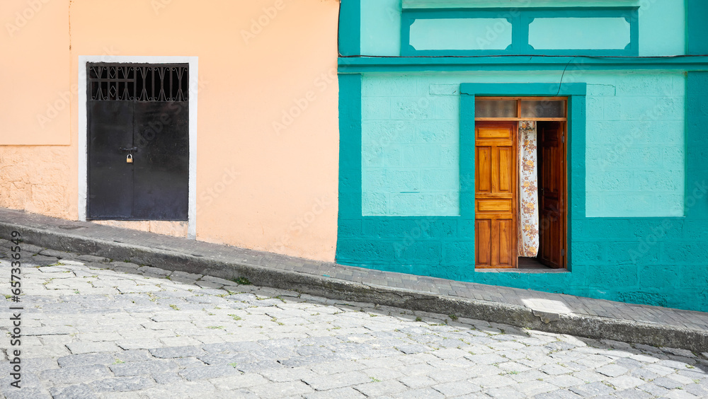Street view of the facade of an old colonial building, architecture background, Ecuador.