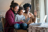 Happy multiethnic diverse family gathering around notebook and having fun during a video call