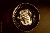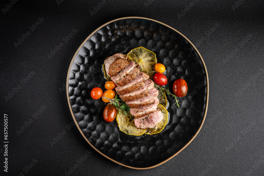 Roasted duck breast fillet on caramelized apples. the dish lies on a black plate on a black background
