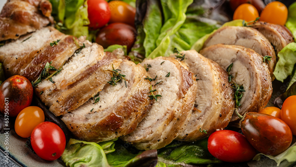 Turkey roll with chicken, apricots, onion and spinach, wrapped in bacon. lies on lettuce leaves with cherry tomatoes. background image