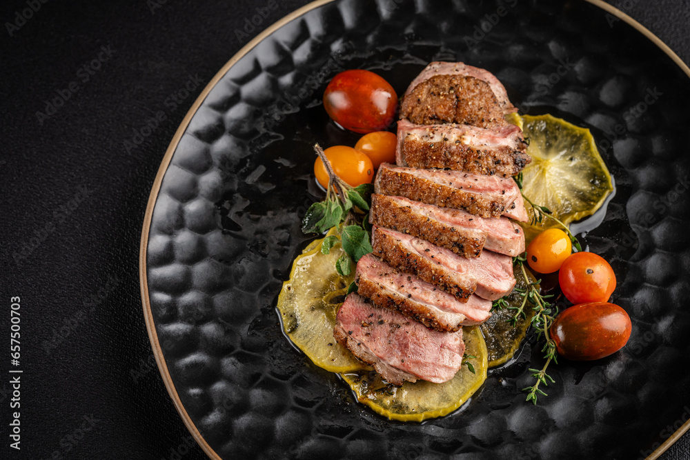 Roasted duck breast fillet on caramelized apples. the dish lies on a black plate on a black background