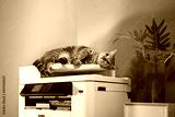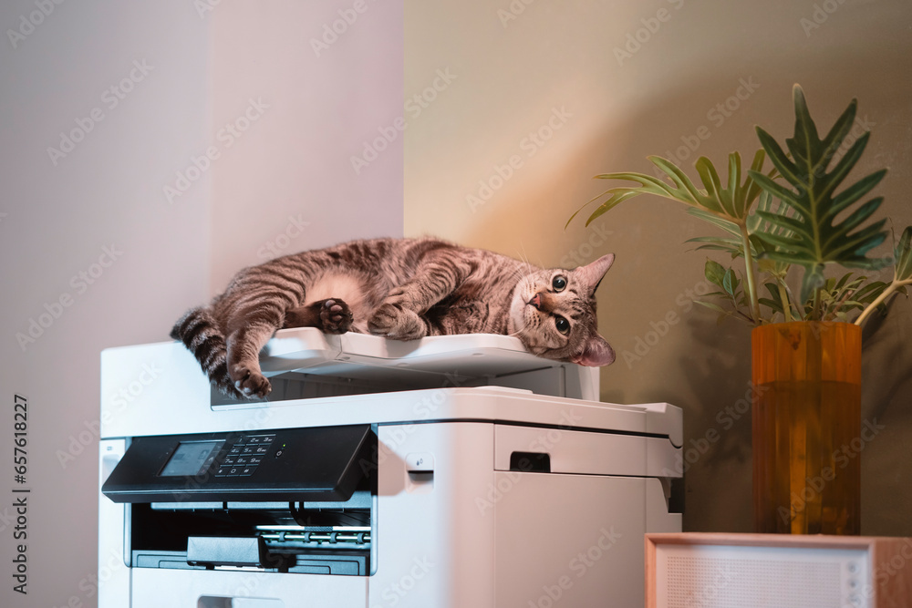 Tabby Cats lying on a multifunction laser printer in home-office documents or paperwork. Secretary work. Print technology. Photocopy.