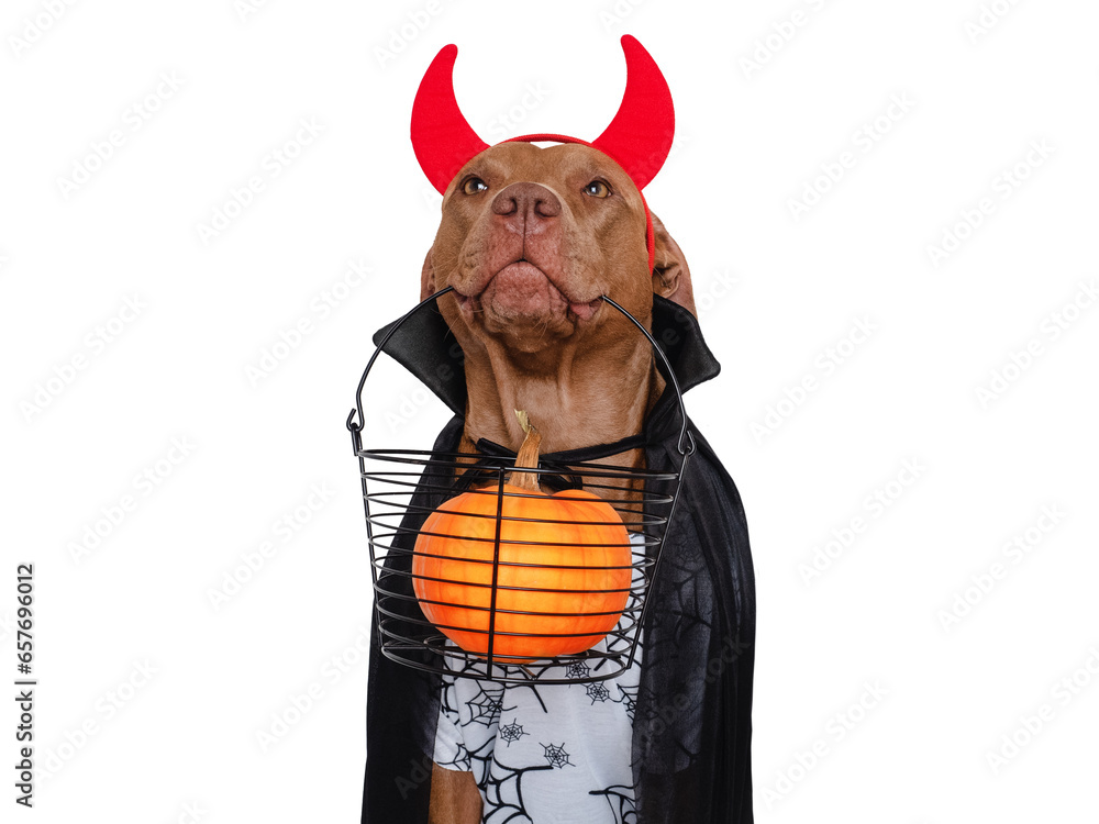 Charming, lovable dog and Count Dracula costume. Isolated background. Close-up, indoors. Studio shot. Congratulations for family, relatives, loved ones, friends and colleagues. Pets care concept