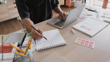 Creative designer working and sketching about graphic design with new project in home studio.
