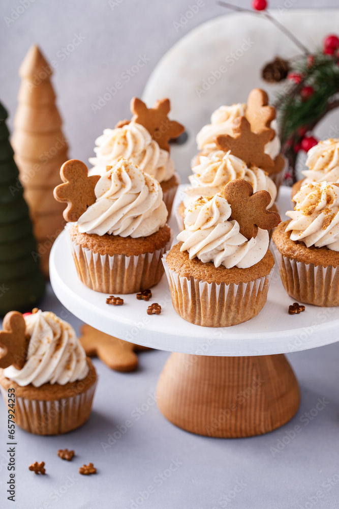Gingerbread cupcakes for Christmas with gingerbread cookies and buttercream frosting