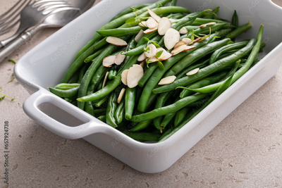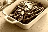 Green beans in a baking dish with slivered almonds, side dish idea