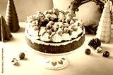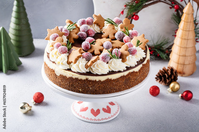 Christmas cake decorated with gingerbread cookies and sugared cranberries, holiday cheesecake idea