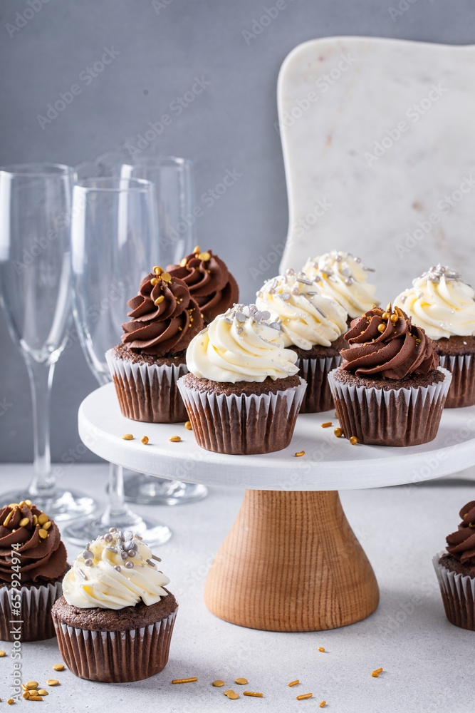 New Years Eve party cupcakes with vanilla and chocolate frosting and festive sprinkles
