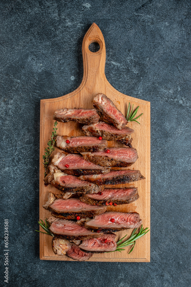 grilled steak Ribeye Black Angus medium rare beef. top view. place for text