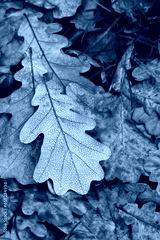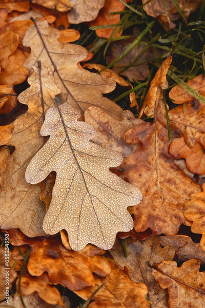 Autumn background. fallen oak leaves with water drops close up, abstract dark natural backdrop. symbol of fall time. autumn season concept. rainy weather. template for design. top view