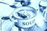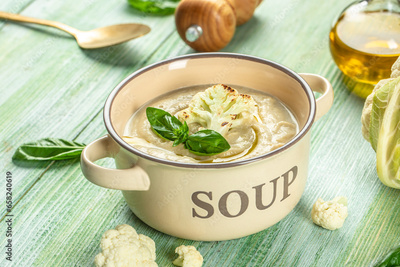 Roasted cauliflower soup on a wooden background, Restaurant menu, dieting, cookbook recipe top view