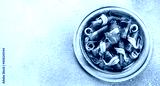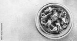 entree of tomatoes and anchovies, Spanish tapas, Long banner format. top view