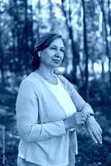 Beautiful calm mature woman with wireless headphones and smart watches walking in nature. Healthy lifestyle concept
