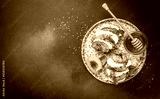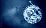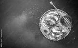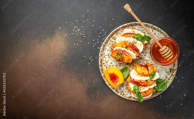fruit caprese salad with peach, cheese and basil leaves on a dark background, banner, menu, recipe place for text, top view